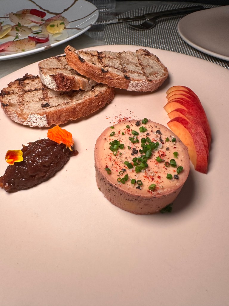 The first course, the Foie Gras Torchon was accompanied by onion compote and black plums and served with sourdough bread. While I found the black plums bitter, the foie gras was buttery perfection, pairing beautifully with the sourdough and onion compote. We also tried the Scallop Crudo with calamansi vinaigrette, heirloom radishes and beets. This dish was a symphony of fresh, light flavors that left a lasting impression.