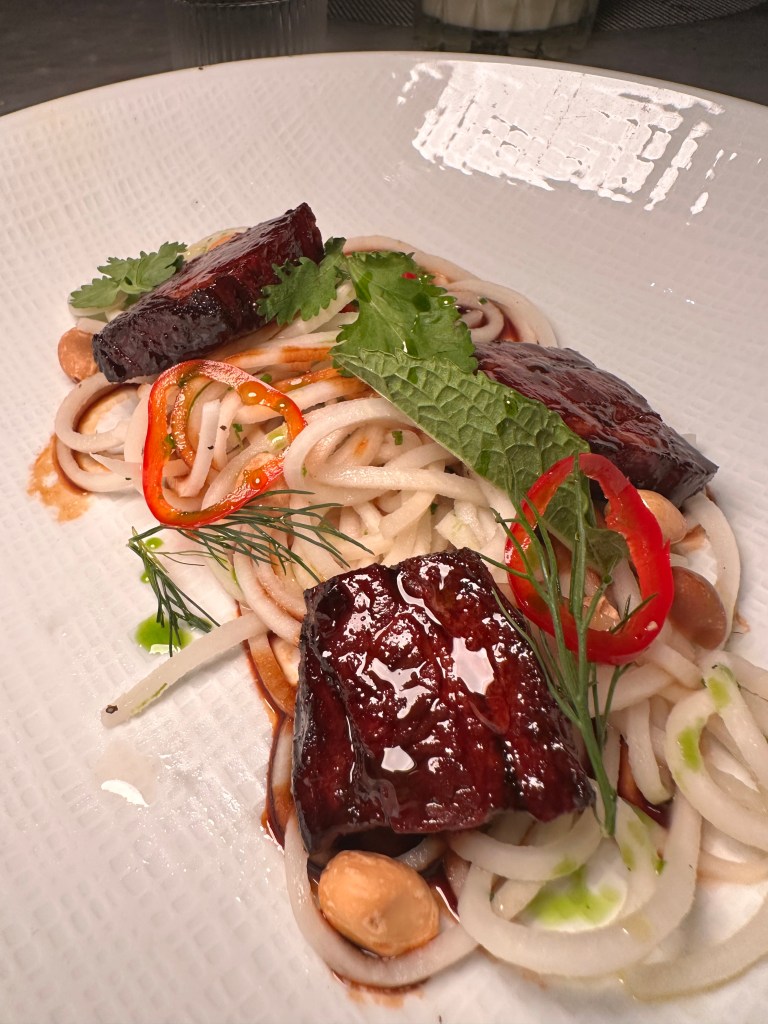 For the main course, I opted for the Pork Belly which was served with turnip noodles. The pork belly was a revelation, bursting with rich, decadent flavors. The turnip noodles, however, were disappointing as their tough texture detracted from the overall dish.