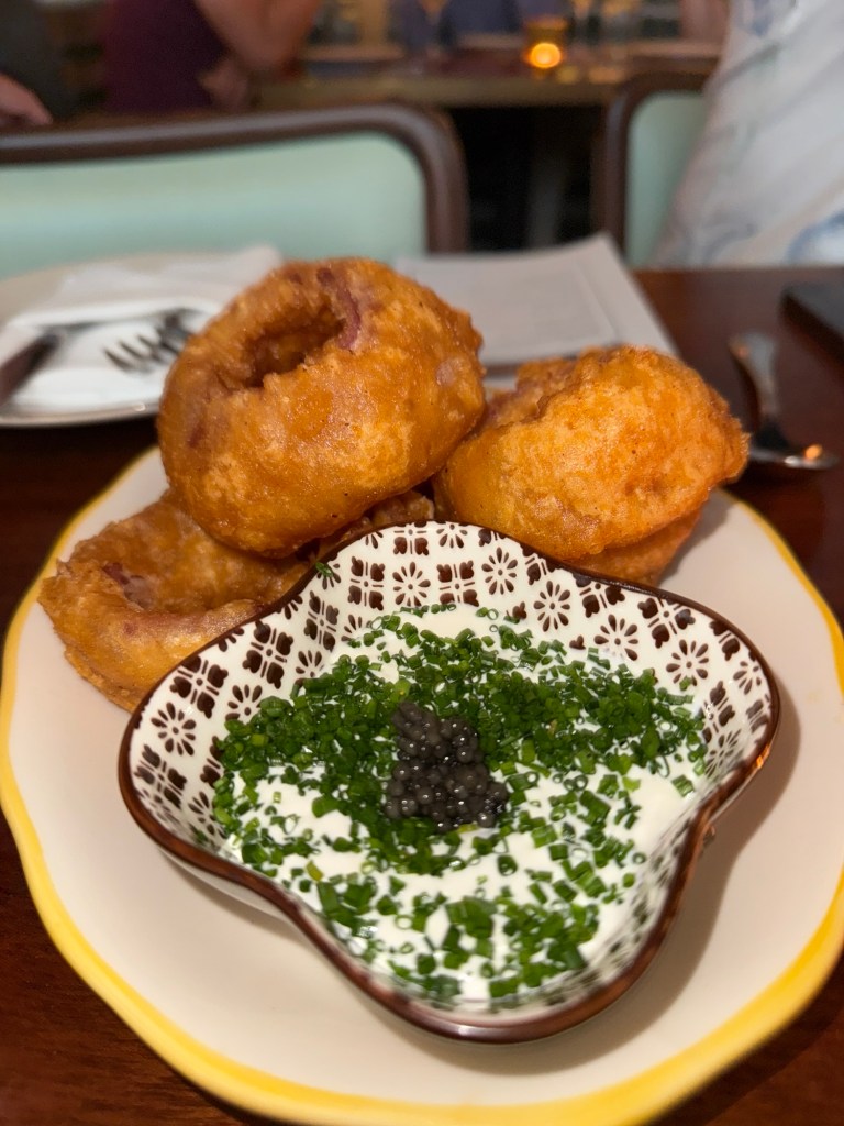 We kicked off our meal with the pickle-fried onions, a whimsical twist on a familiar favorite. Imagine onion rings on steroids: these are lightly pickled red onions, battered and fried to golden perfection, served with a luxurious caviar crème fraîche. The delicate tang of the pickling process allows the natural flavor of the onion to shine, making this dish a delightful start.