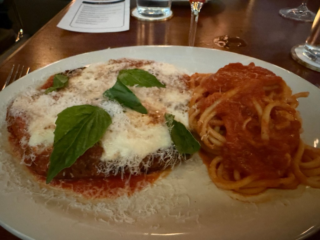 We also ordered the Chicken Parm, a dish I usually bypass in restaurants since it is a fairly basic dish that doesn’t lend itself to a lot of creativity. But our attentive server convinced me otherwise, and I was pleasantly surprised. This rendition was spectacular—juicy free range chicken, a well-seasoned crispy crust, the perfect ration of Parmesan, and a generous side of Bolognese pasta. The portion was so ample that I found myself looking forward to lunch the next day.