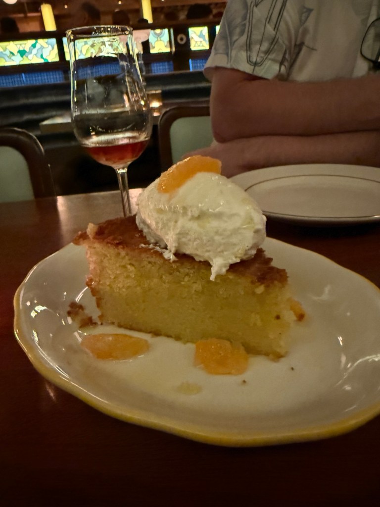 Dessert was a glorious olive oil cake that defied expectations. Moist and fragrant with the perfect crunchy crust, it was served with whipped cream and orange slices. The cake struck the perfect balance – not too sweet and not too citrusy. This simple yet extraordinary dish left us utterly satisfied.