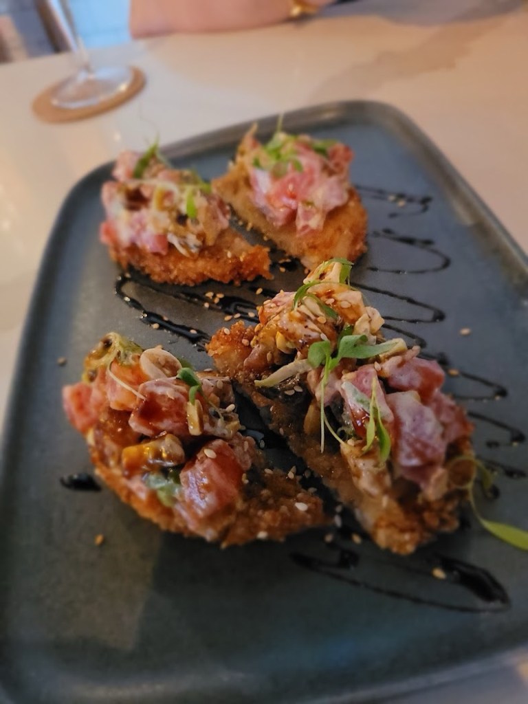 Great cocktails deserve great food, and La Identidad does not disappoint. Their menu is playful, bold, and incredibly well-executed. So of course, we couldn’t leave without trying a few of the options. We started with the Crocantes de Atun. This dish was so good that I had to order more! A mix of tuna, spicy mayo, sweet plantain, and chives, served over a crispy sticky rice cake. The textures and flavors were incredible making this dish a must-try.
