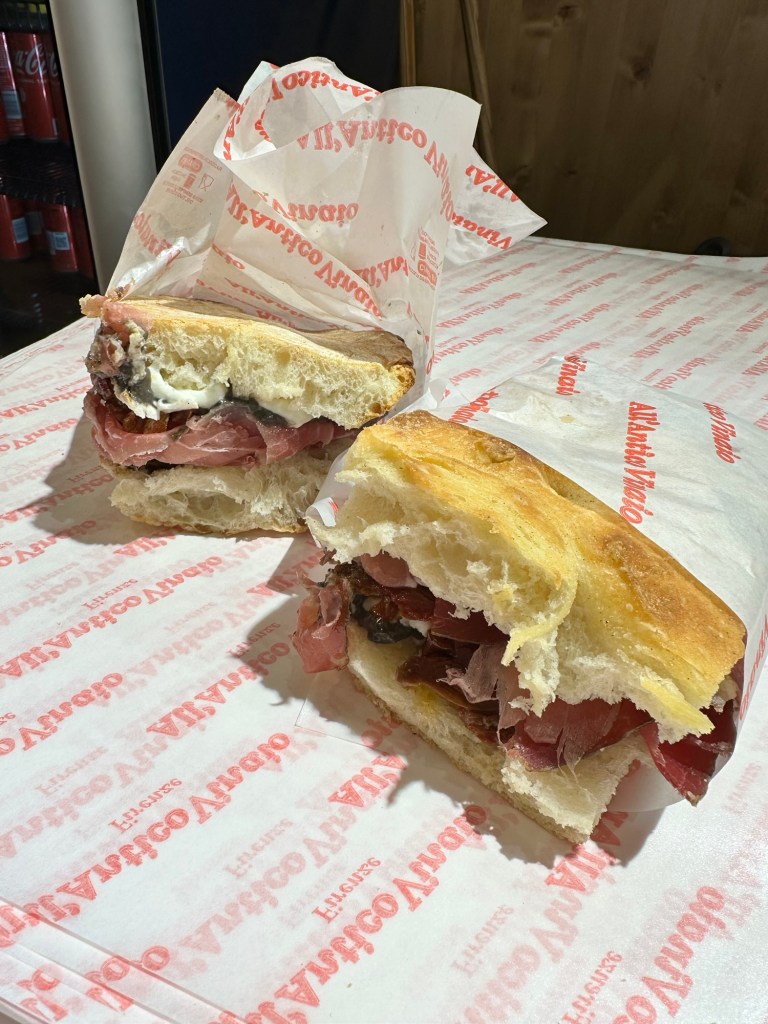 The atmosphere is lively and chaotic, with long lines. We ordered our generously portioned panini and enjoyed them sitting on a step with a glass of wine in a plastic cup. Each bite justified the wait.