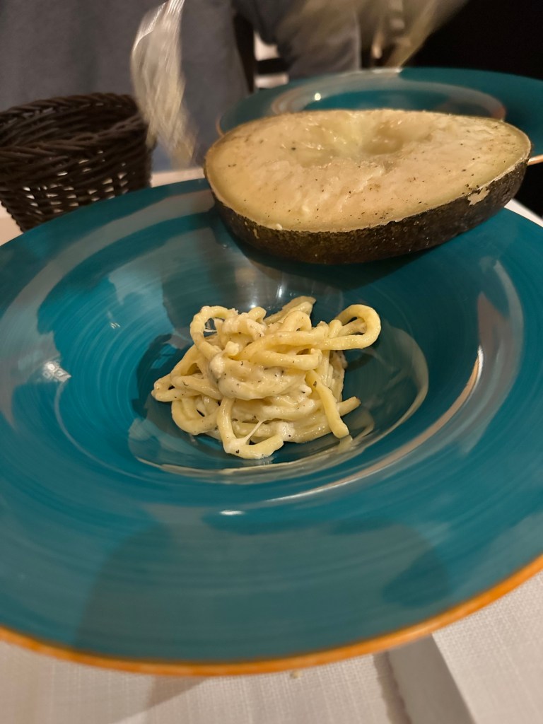 The first course celebrated handmade pasta: the special pici, a type of thick spaghetti, prepared with pecorino from Pienza, black pepper, and truffles. The most memorable aspect was how the pasta was mixed directly in a wheel of Parmesan, adding richness and creaminess that elevated the dish to a sublime level. Each bite was a reminder that sometimes the simplest ingredients create magic.